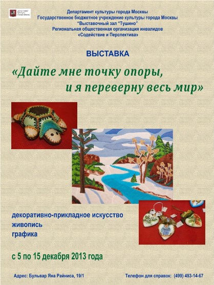 С 5 по 15 декабря 2013 года в выставочном зале «Тушино» проводится выставка творческих работ инвалидов «Содействие и Перспектива». Представленные работы выполнены в технике аппликации, вышивки, бисероплетения, керамики, а также живопись, графика, авторские игрушки и др.