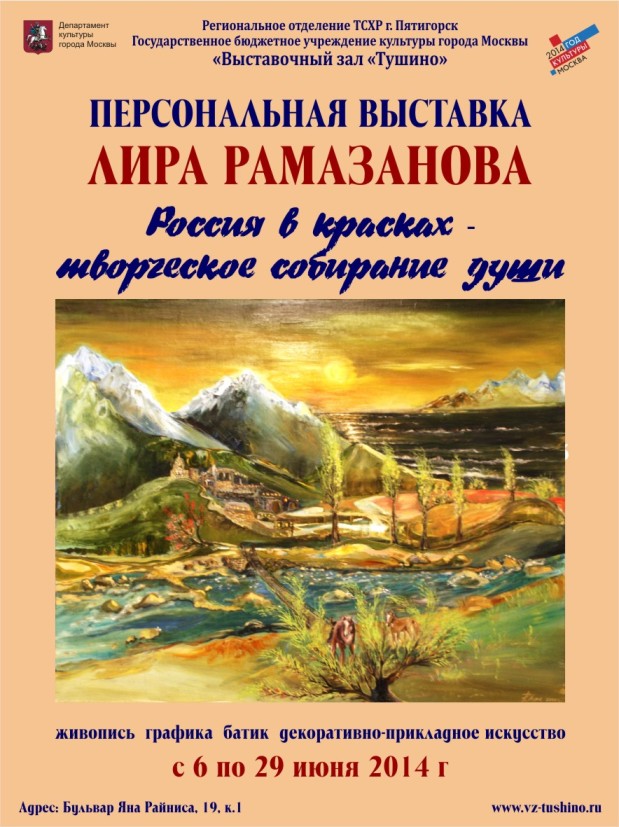 Член ТСХ России Лира Магалиевна Рамазанова и вице-президент ТСХ России по Северо-Кавказскому Федеральному Округу почетный член РАХ Александр Михайлович Рубец представляют выставку «Россия в красках — творческое собирание души». Участники выставки: художник-фронтовик Магали Курбанов, члены Творческого Союза художников России — Лира Рамазанова, Оксана Таджибова, Зельфира и Заира Гаджиевы, Мелик-Мамед Агабалаевич Агабалаев, Закарья Закарьяев, а также Гарунова Ксения (11 лет), Власова Лиза (11 лет), Асриянц Юрий (10 лет), Арутчева Кристина, Юлия Коновалова (17 лет), Зухра Хубиева (18 лет).