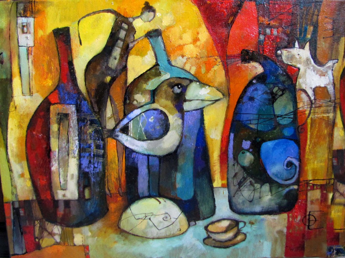 Незатейливые персонажи в окружении предметов по-прежнему живут своей жизнью, наблюдая с едва заметным любопытством за тем, что происходит за периметром картины. Влюбленные парочки, загадочные девушки, чудаковатые коты разговаривают, отдыхают, пьют кофе, чай и глинтвейн, словно составляя компанию присутствующим в зале, так что даже одинокому посетителю не будет тоскливо.