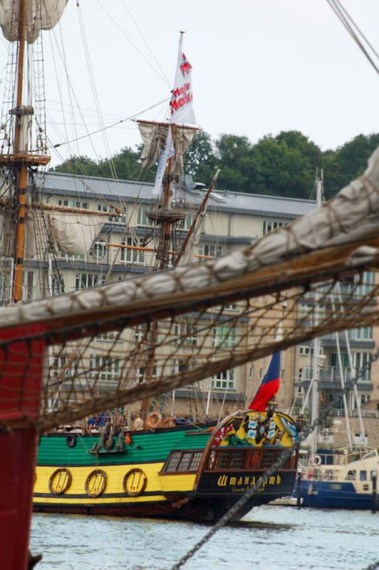 Над мачтами развиваются флаги государств и среди них наш Российский государственный стяг.