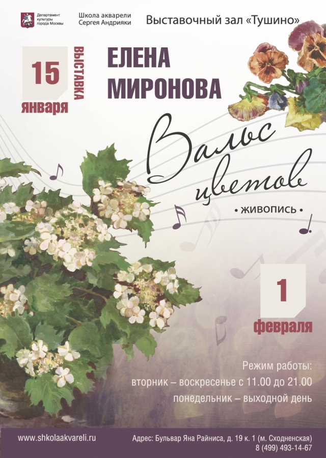 Выставки • Новости 15.01-01.02.2015 — Персональная выставка Елены Мироновой «Вальс цветов» 278 просмотров Персональная выставка Елены Александровны Клюевой (Мироновой) — художника-преподавателя Школы акварели Сергея Андрияки.