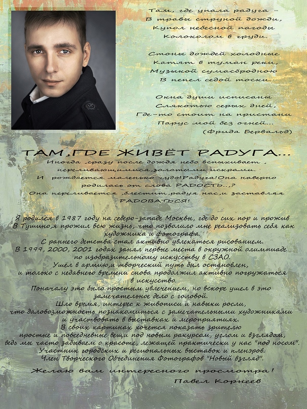 В выставочном зале «Тушино» открылась персональная выставка Павла Корнеева «Там, где живет радуга» (живопись). Это первая персональная выставка молодого талантливого художника, жителя нашего района. афишаинетрезюме инет