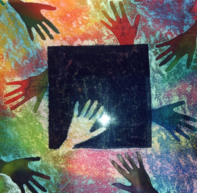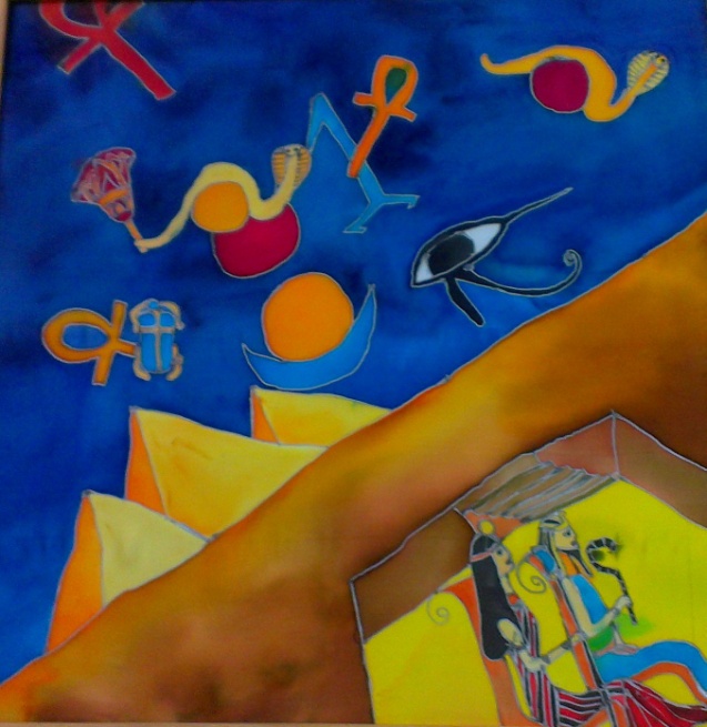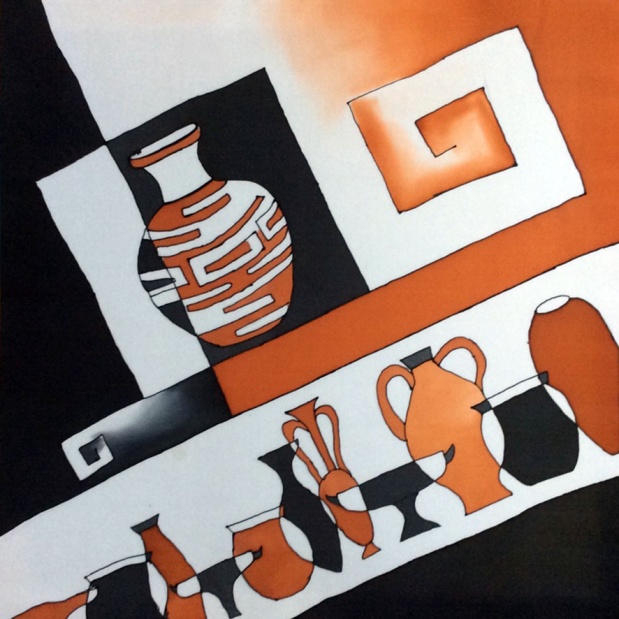 Задача художников, участников выставки, состояла в том, чтобы вписать основные этапы истории культуры: наскальные росписи, Древний Египет, Грецию, Средние века, современность и даже будущее в простые геометрические формы русского авангарда. Эта непростая задача была решена в различных техниках батика: холодном, горячем, смешанной технике. Фактура также имела большое значение в авангарде, так и мы свои работы выполняем на различных тканях, это тончайший шифон, блестящий атлас, плотный хлопок, которые влияют на композиционное решение.