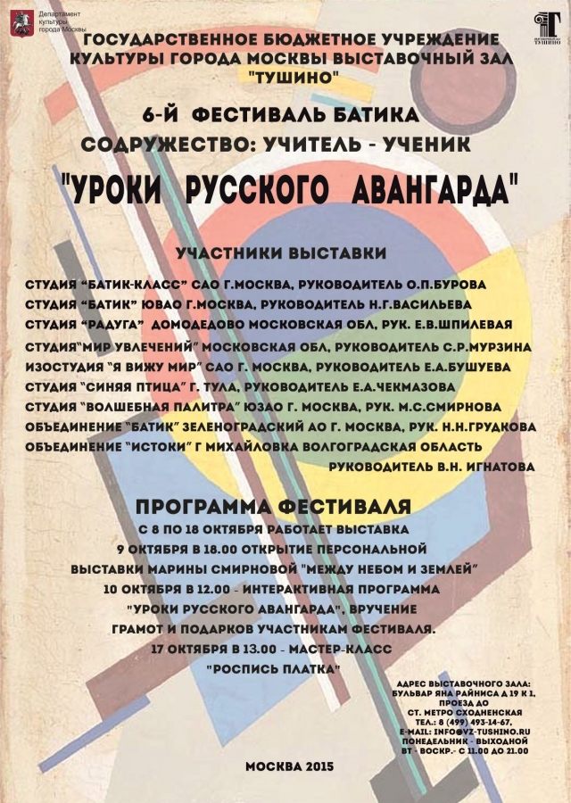 В выставочном зале «Тушино» с 8 по 18 октября 2015 года пройдет 6-ой Фестиваль батика «Содружество: учитель – ученик», основным принципом которого является участие в выставке педагога вместе со своими подопечными. В этом году в фестивале участвуют девять студий батика из Москвы, Тулы, Московской и Волгоградской области, всего около 60-ти детских работ и 20 работ художников-батикистов будут представлены на выставке. Также в рамках фестиваля состоится персональная выставка «Между небом и землей», одного из педагогов, а именно Смирновой Марины Станиславовны. Марина – член Международной Ассоциации «Союз Дизайнеров», участница городских выставок и фестивалей батика, руководитель детской студии «Волшебная палитра» в МБУ ЦДС «Соц- Ин» с 2002г.